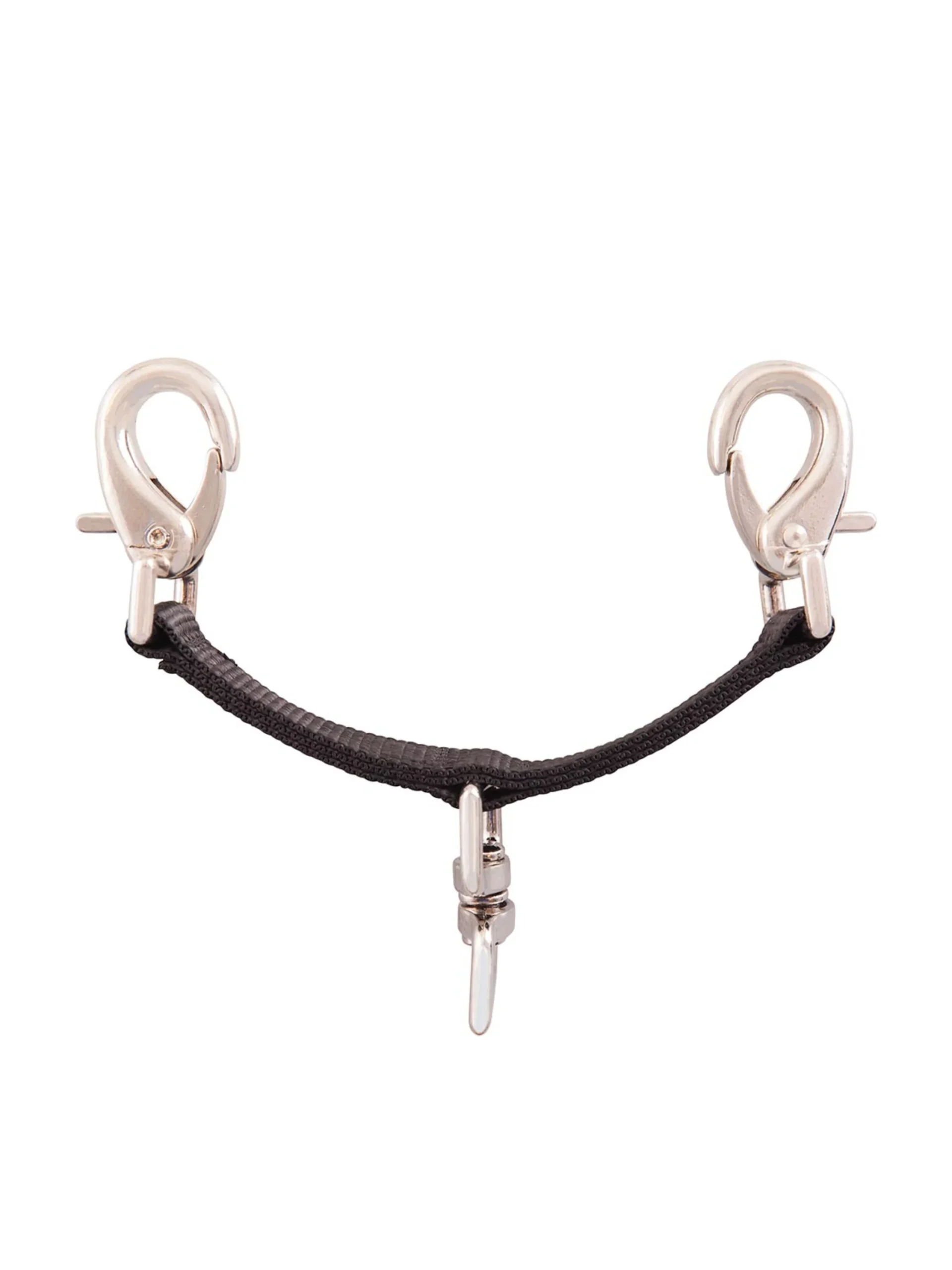 Alliance de longe en nylon. Elle dispose d’un swivel pour attacher la longe de travail. L’alliance de longe peut être fixée au mors ou licol par deux clips. Cette alliance permet de garder la même tension sur les deux côtés du mors et évite au mors de sortir de la bouche si le cheval tire vers l’extérieur.