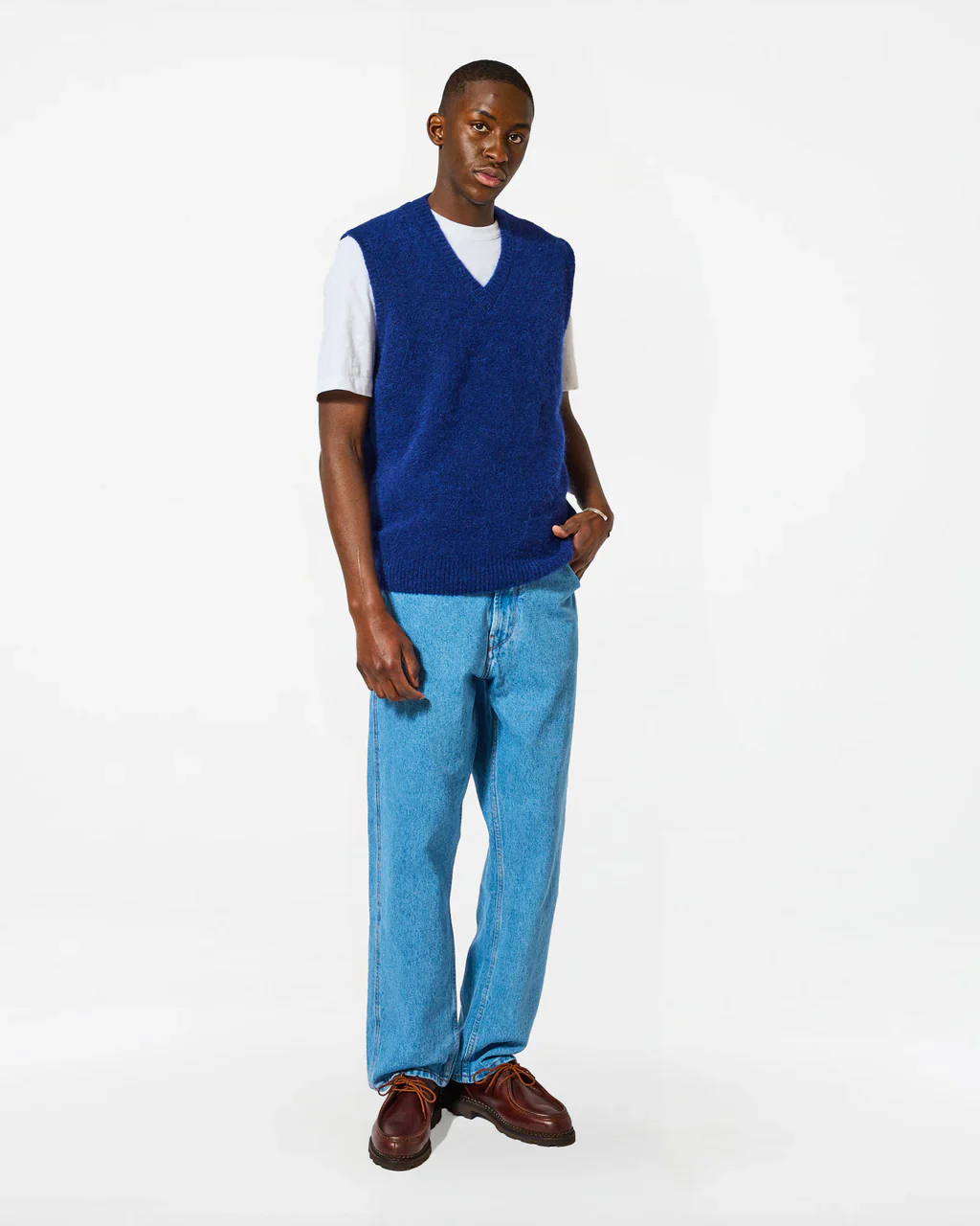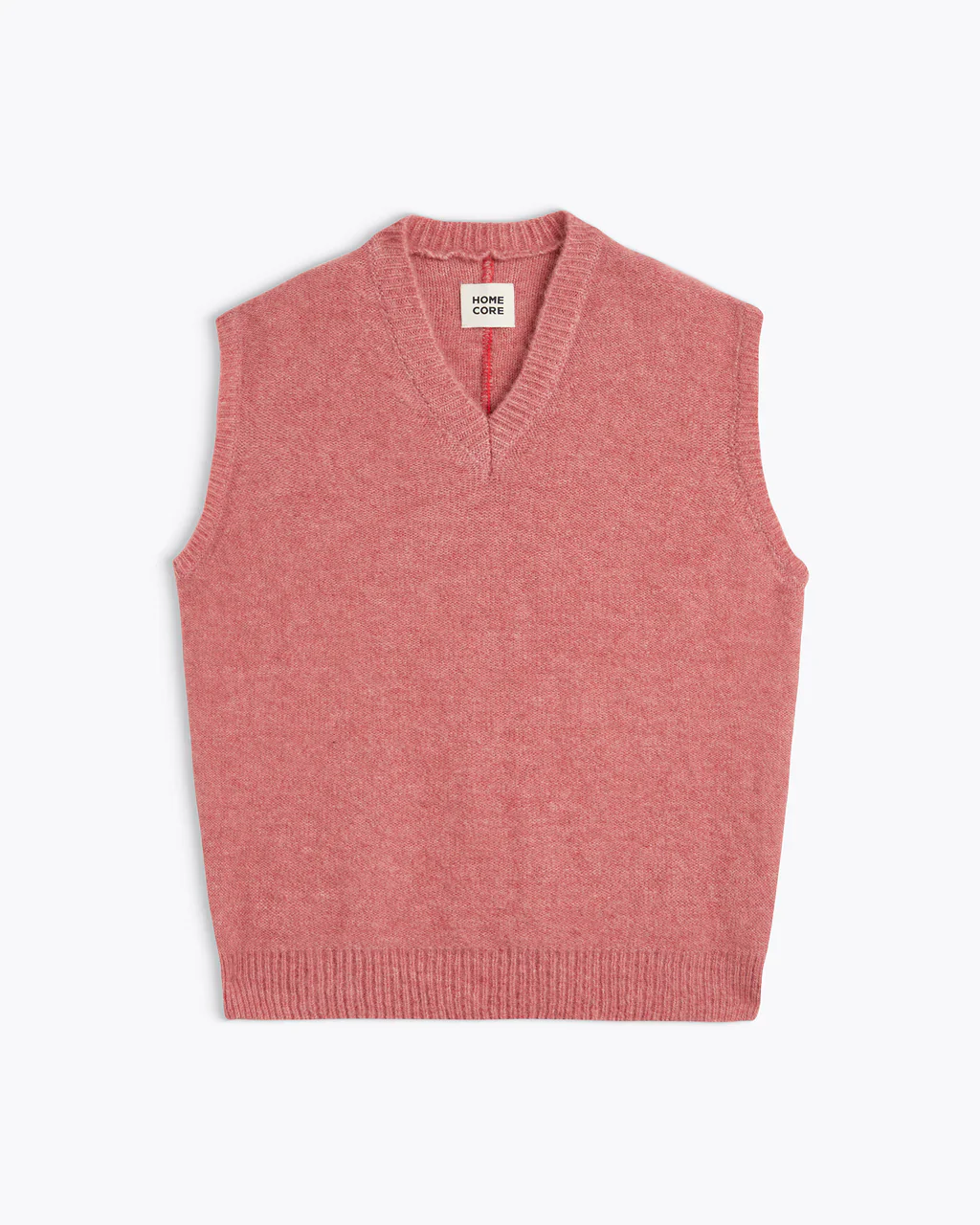 Pull sans manches / débardeur en maille Col en V Matières : 48% Bébé Alpaga, 21% Laine, 28% Polyamide, 3% Elasthanne Le mannequin mesure 183 cm et porte la taille L Coupe : droite La ligne rouge piquée dans le dos, signature emblématique de Homecore, symbolise l’équilibre du corps et de l’esprit Fabriqué au Portugal