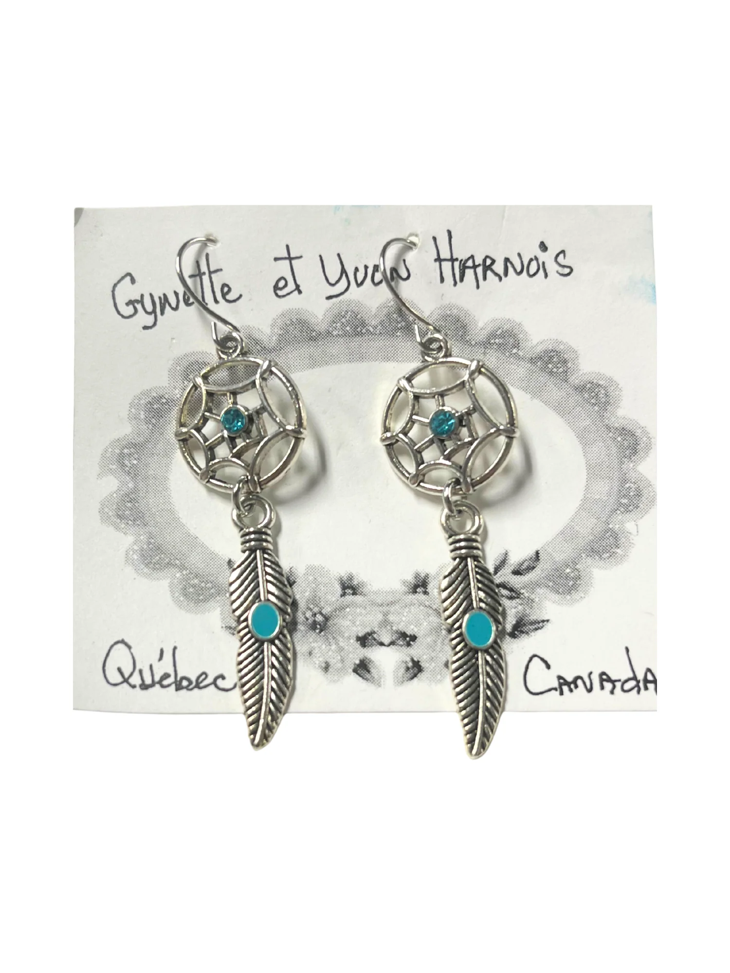 Boucles d’oreilles capteur de rêve turquoise Pendantes avec long anneau Couleur argenté