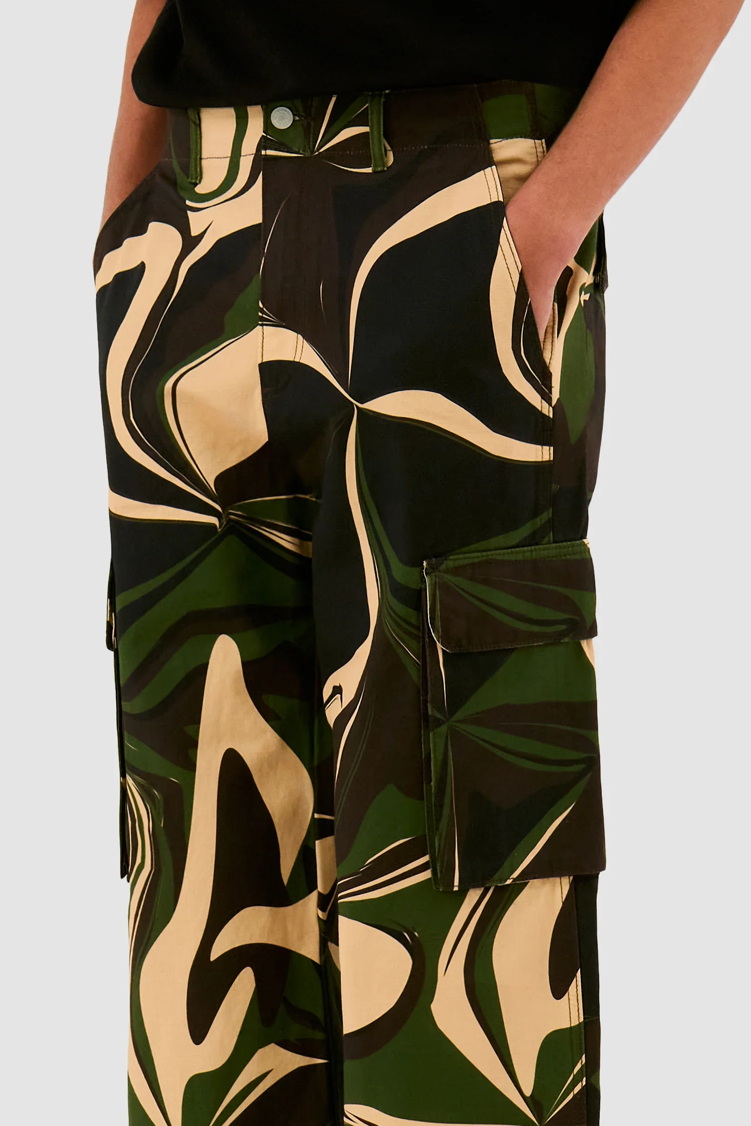 Le pantalon Camo Cargo Pants est fabriqué en coton de première qualité, il présente un imprimé camouflage audacieux et a une coupe large. Le pantalon possède deux poches cargo, deux poches latérales et deux poches arrière pour une fonctionnalité maximale.