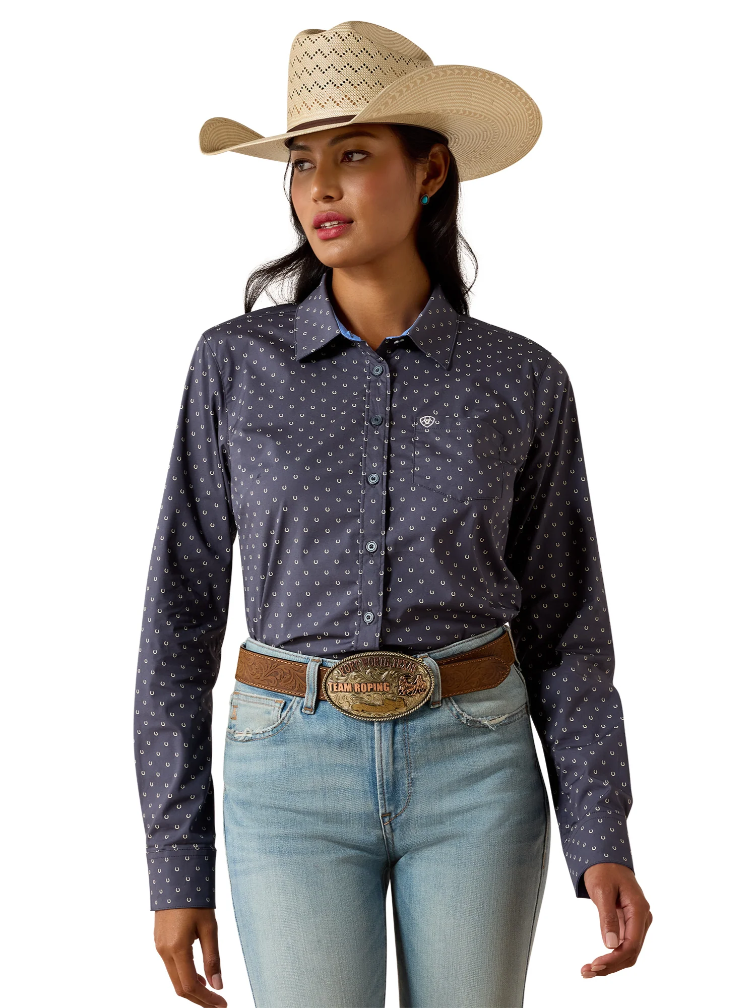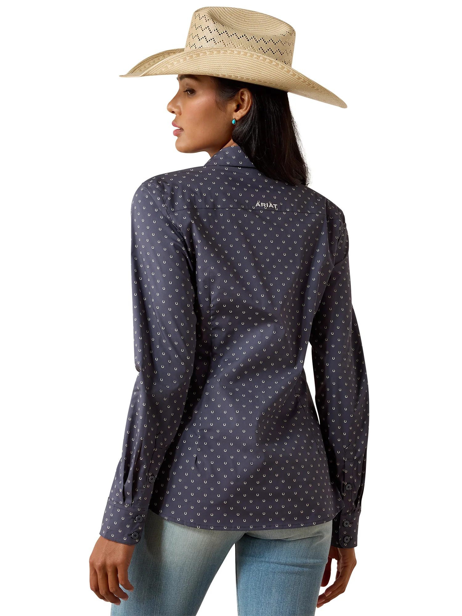 La patte de boutonnage et la couture du col tapées renforcent la structure du vêtement, tandis que la poche poitrine ajoute une touche pratique. Le motif Ombre Blue Horseshoe apporte un style western subtil et distinctif, facile à assortir avec un jean ou une tenue d’équitation.
