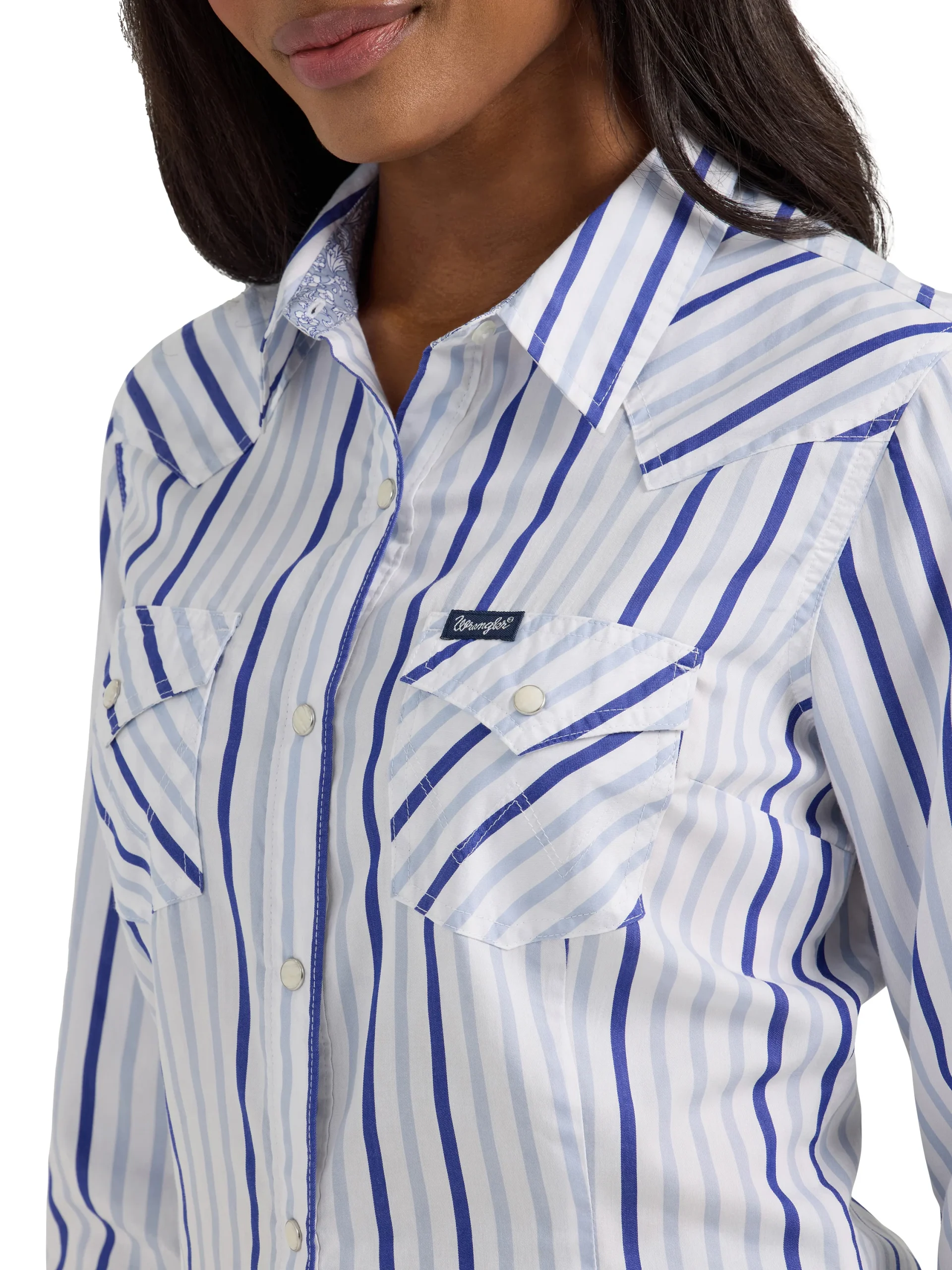 Affichez un look western rétro avec la chemise à manches longues Wrangler pour femme. Ce modèle polyvalent à rayures bleues est idéal pour les journées fraîches ou les occasions décontractées. Sa coupe ajustée et son col évasé ajoutent une touche élégante, tandis que les poches à rabat sur la poitrine et les poignets à boutons-pression apportent un style pratique et authentique.