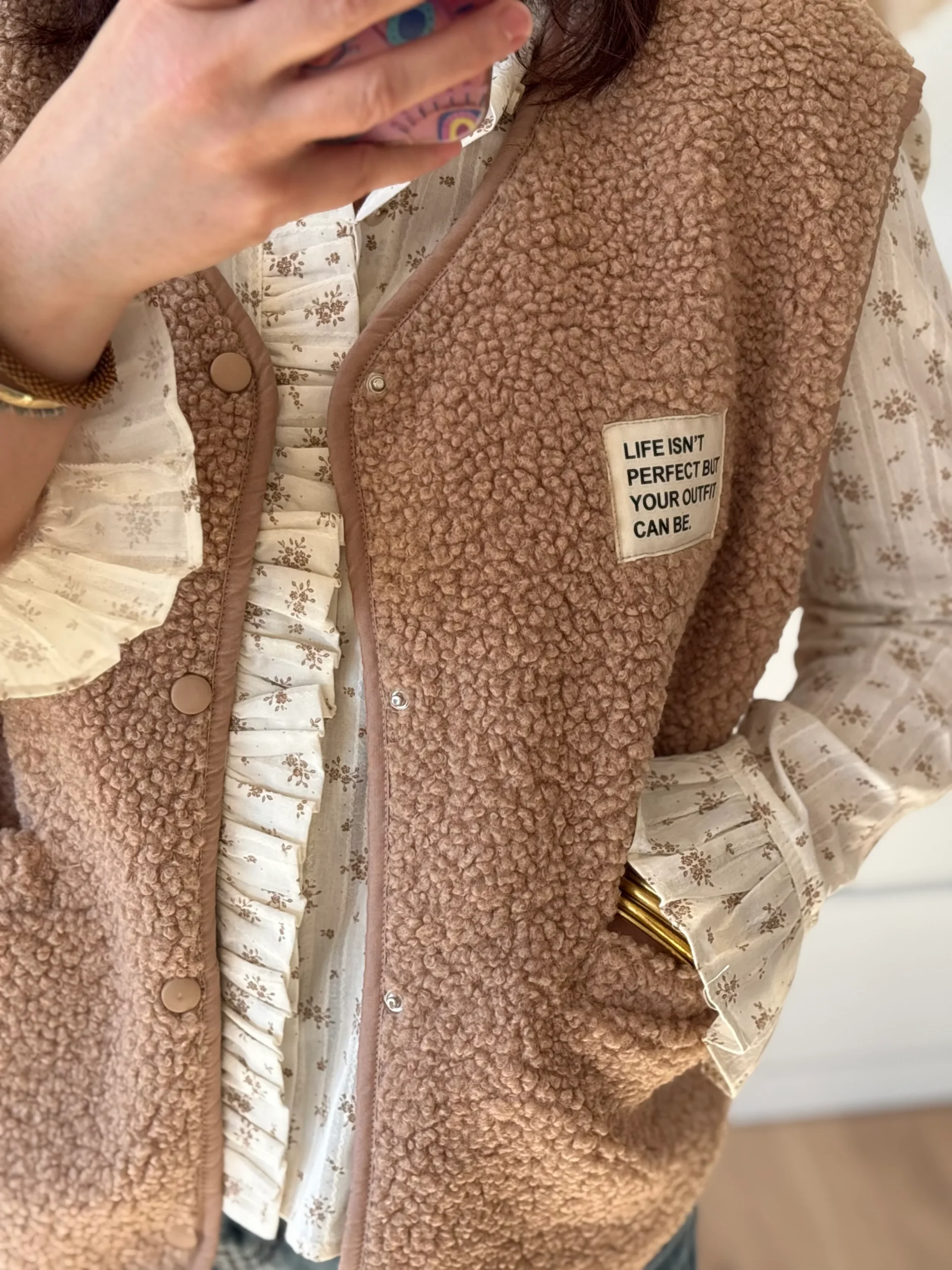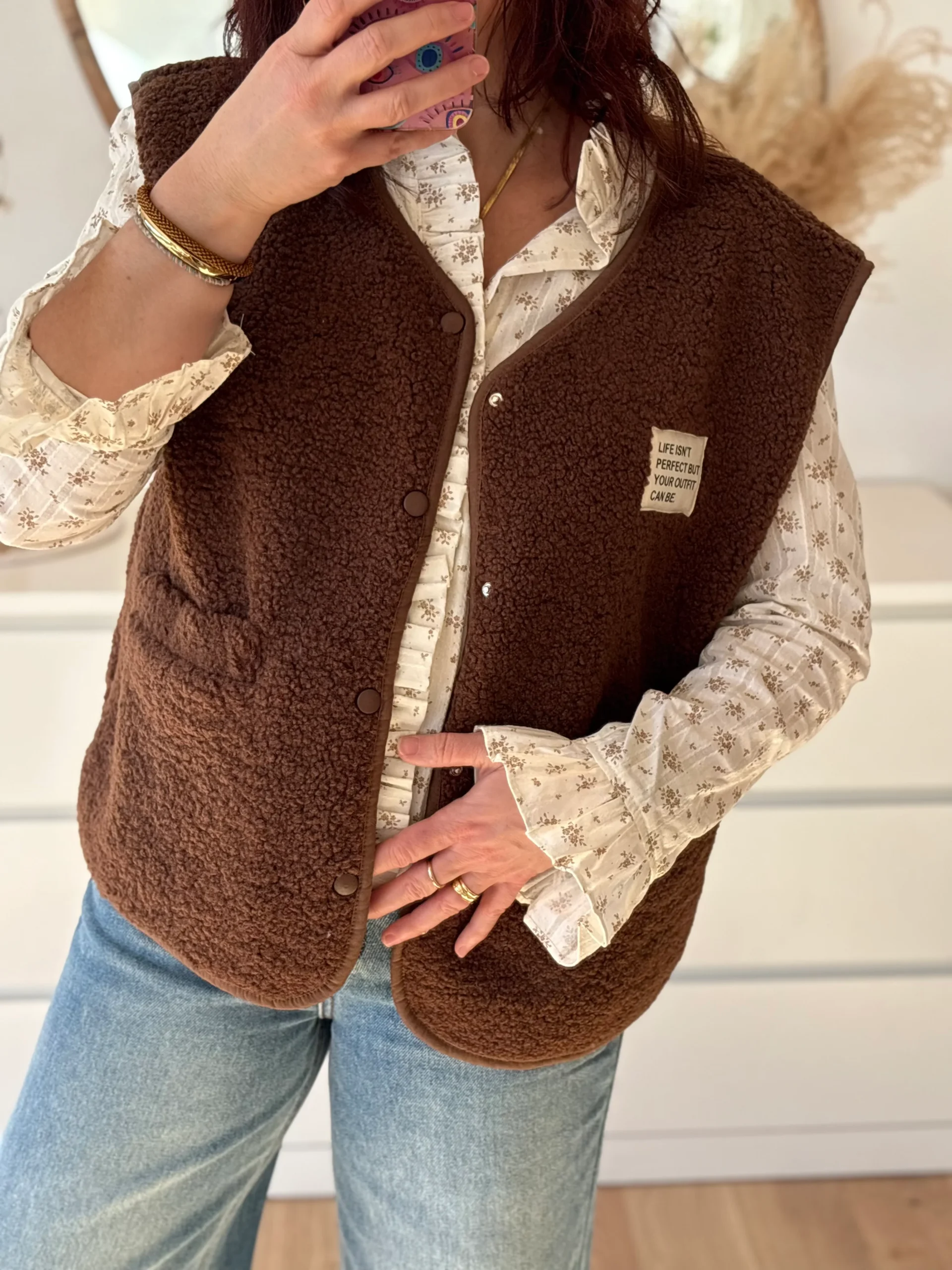 Portez-le rentré dans un jean pour un look casual chic du quotidien, ou glissé sous un pull cocooning ou une veste sans manches teddy pour réchauffer la silhouette tout en gardant ce joli détail de col et de manches apparentes. Parfait avec des bijoux dorés pour souligner son esprit bohème ✨