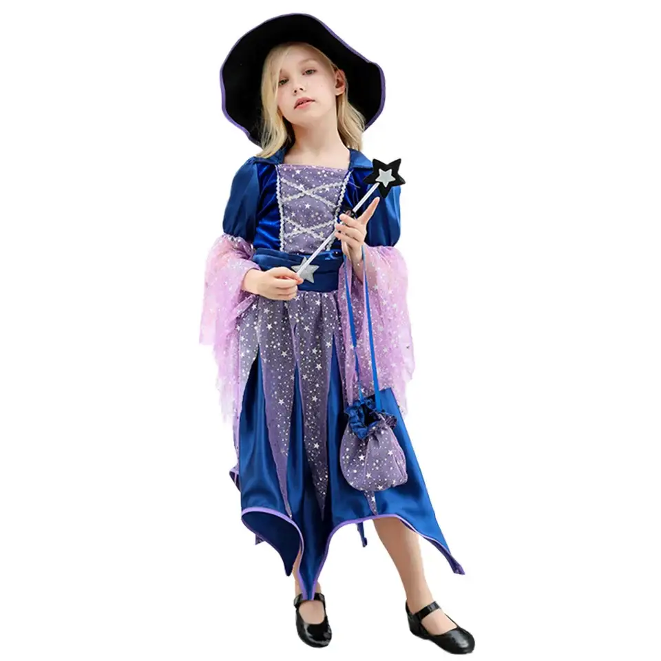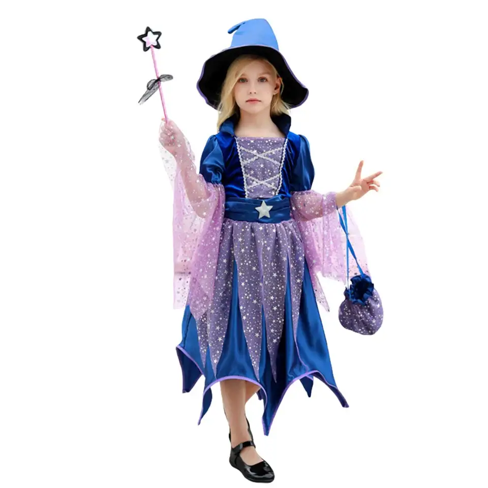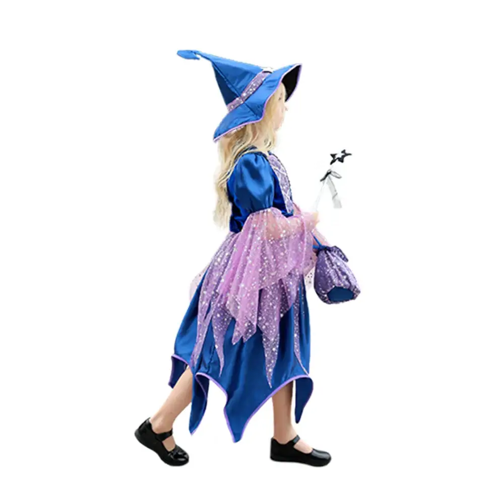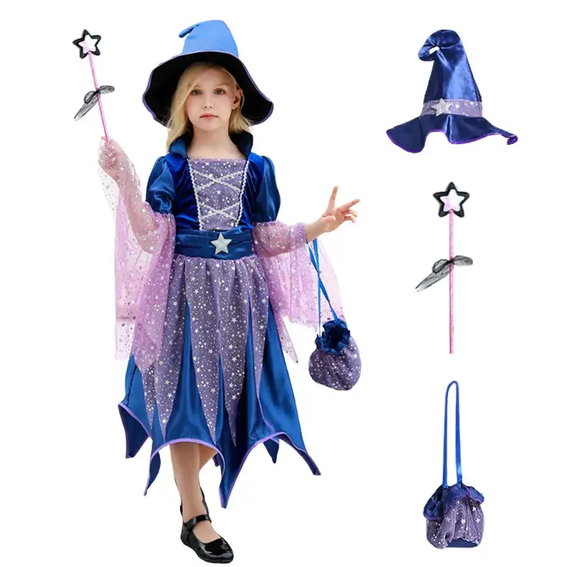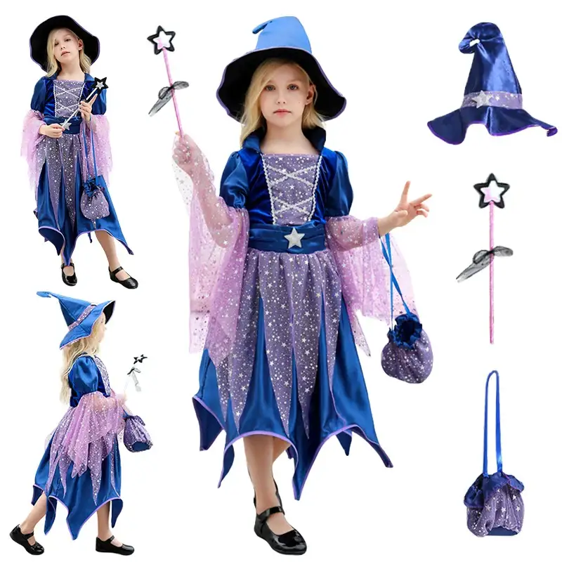 - Ensemble complet : Robe, chapeau, baguette magique et sac à main inclus, offrant une transformation immédiate et sans effort.