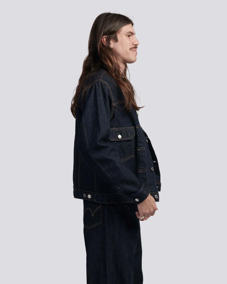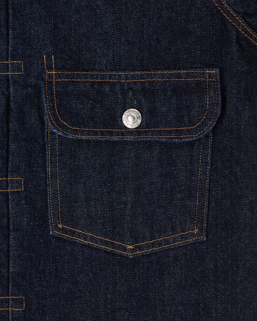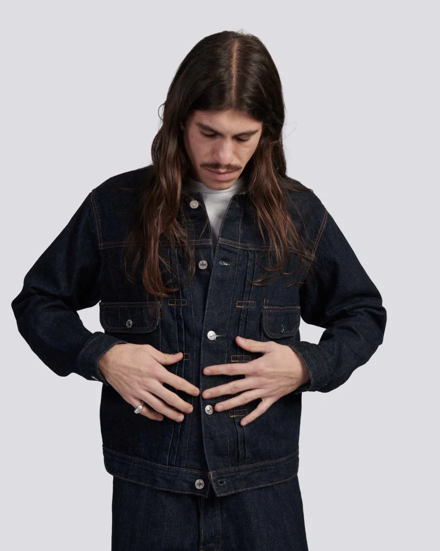 Veste en jeans Référence : I033604 Matière : 100% coton – 14oz Kurabo Recycle Denim Red Selvage Coupe : Regular Fermeture à boutons Fabriqué au Japon Le mannequin mesure 182 cm et porte une taille M