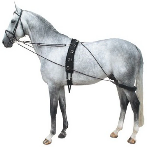 L’enrênement Pessoa sollicite les muscles du dessus en utilisant d’abord la position basse pour développer les muscles du bas de l’encolure, puis progressivement les positions hautes plus semblable au travail monté. Au galop, l’enrênement Pessoa force le cheval à soulager l’avant main, à ramener les postérieurs sous lui ce qui améliore l’équilibre.