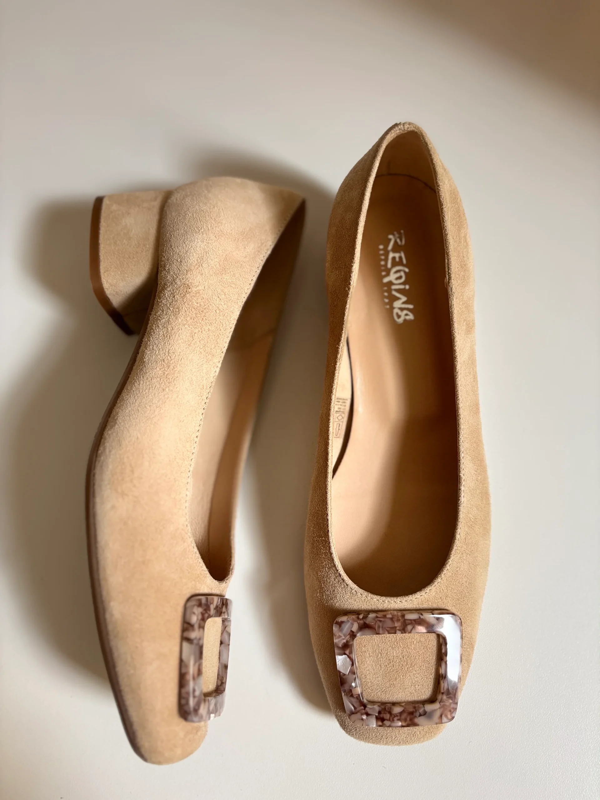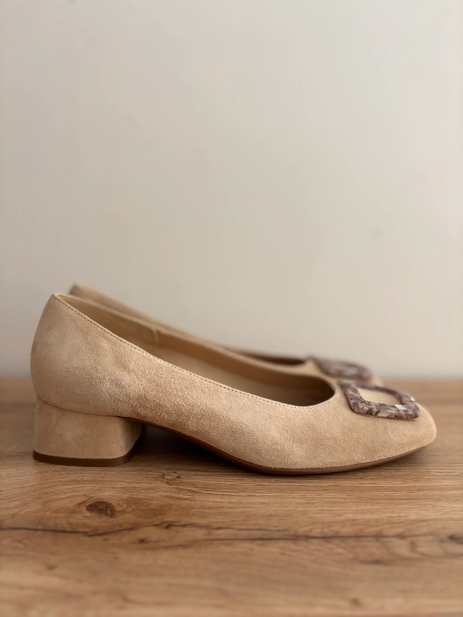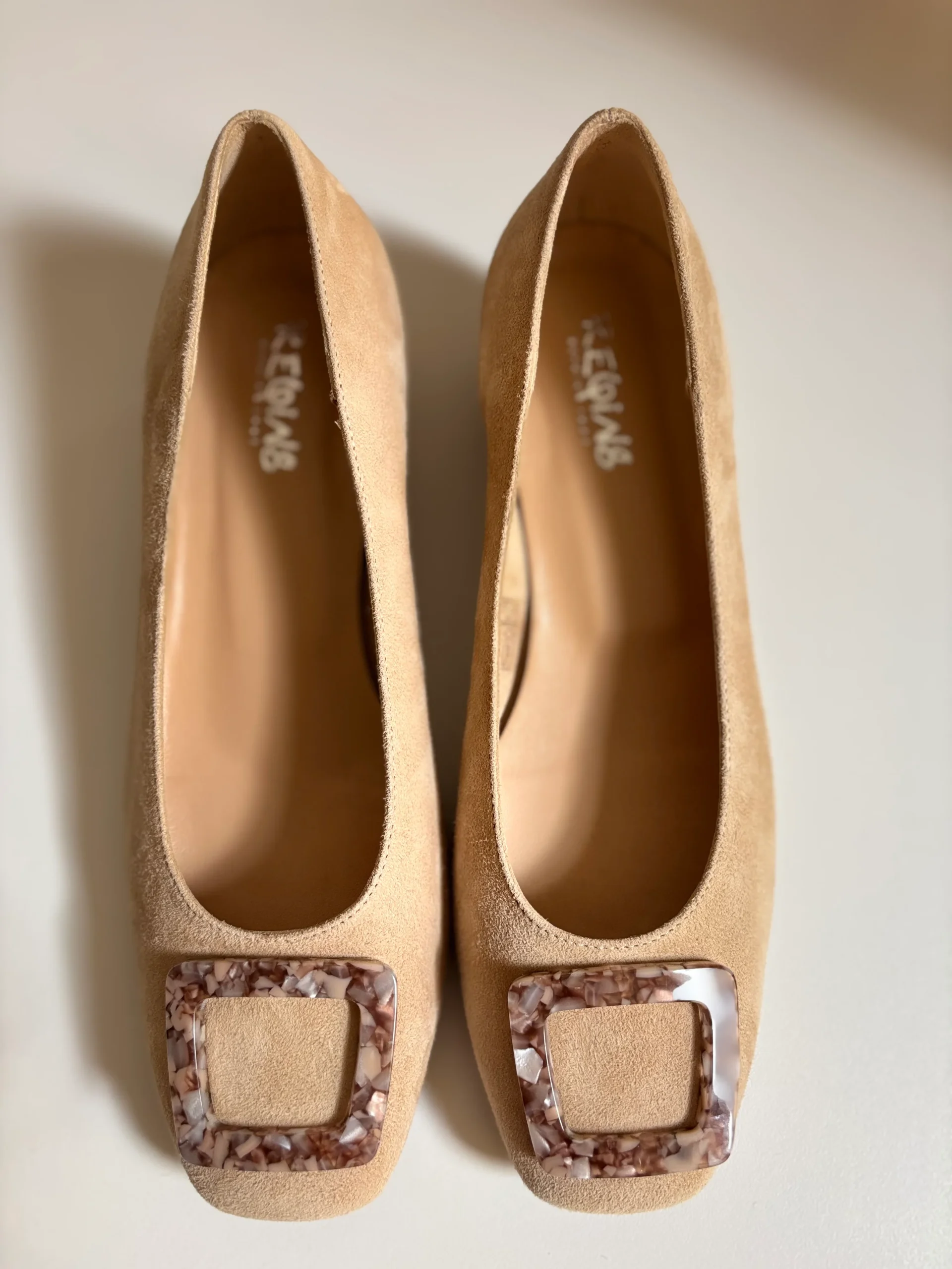 Cette ballerine à talon en peau bout carré avec son bijoux écaille lui donne son côté chic pour toute occasion, une cérémonie, une soirée ou une balade en ville.