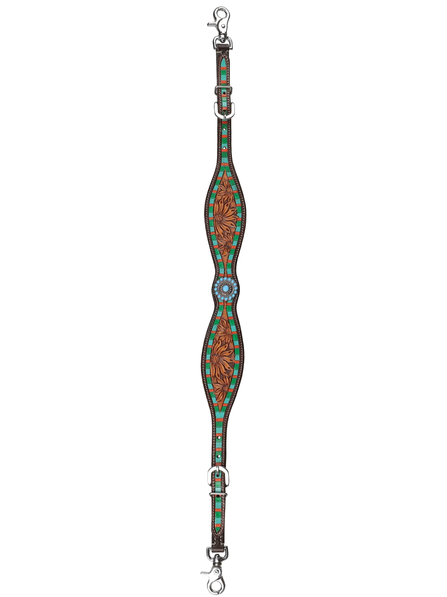 Un concho central décoratif ajoute un point focal audacieux, tandis que la couture contrastante encadre le design pour une finition nette et raffinée. La sangle est entièrement ajustable grâce à des boucles solides et des extrémités à mousquetons pivotants, permettant une fixation facile et sécurisée à la plupart des breast collars. Cette conception assure un maintien optimal, empêchant le glissement et garantissant un confort et une stabilité maximale pour votre cheval à chaque utilisation.