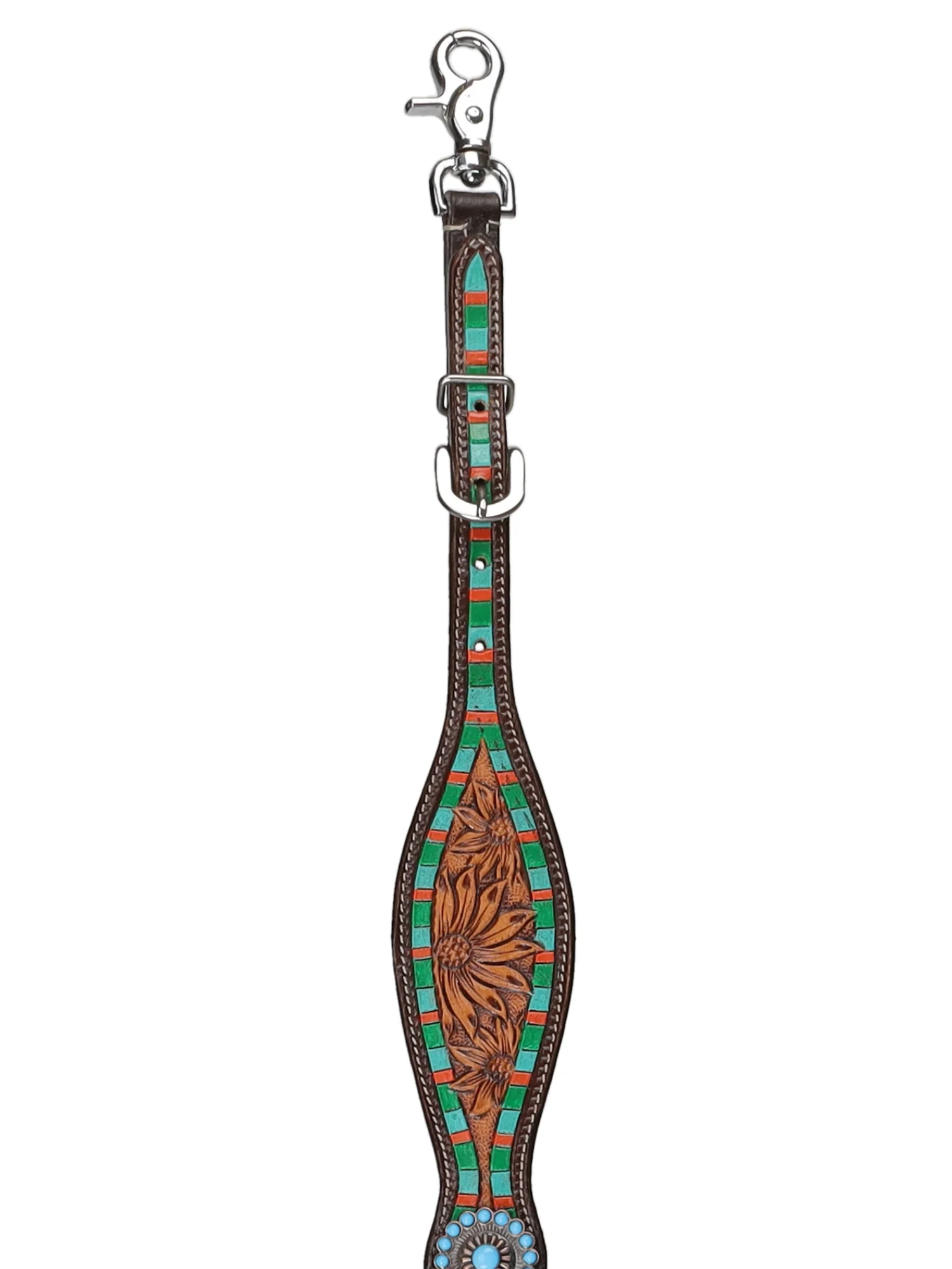 Apportez à votre équipement une touche de sécurité et de style western avec la sangle de garrot Showman Desert Bloom. Conçue en cuir véritable de qualité supérieure, cette sangle se distingue par sa bordure peinte à la main et son motif floral délicat, inspiré par les couleurs chaudes et naturelles du désert. Les teintes turquoise, corail et tons terreux créent un contraste saisissant et apportent une esthétique unique à votre équipement.