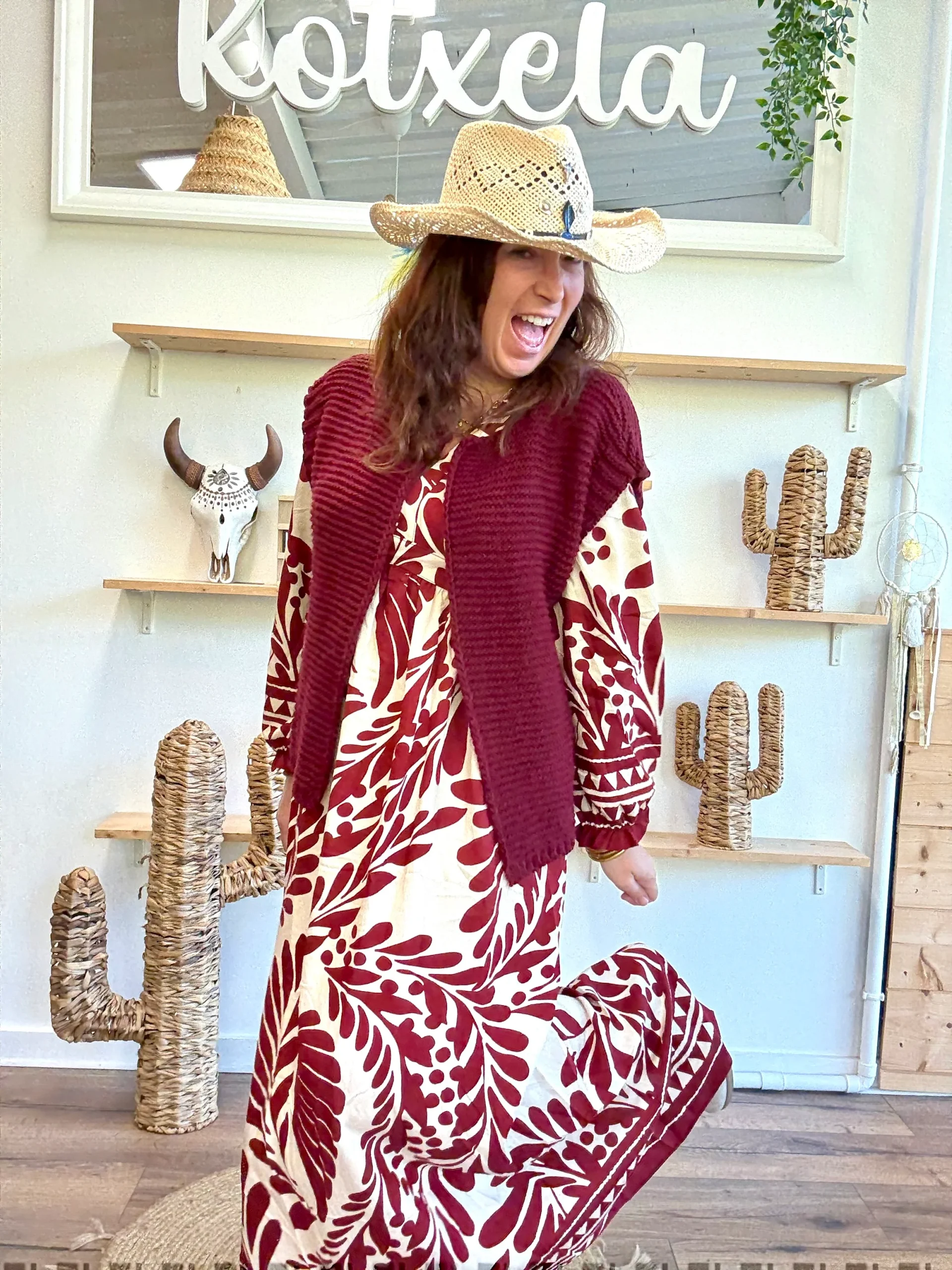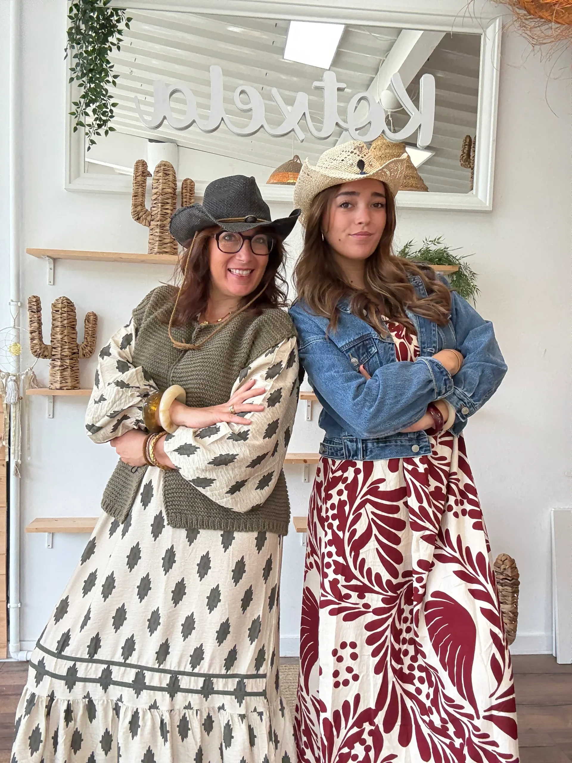 L’allure cowgirl rencontre l’élégance bohème : la robe Santa Fe est votre alliée de la saison pour un style affirmé et confortable. Son imprimé feuillage graphique et sa coupe fluide subliment toutes les silhouettes.