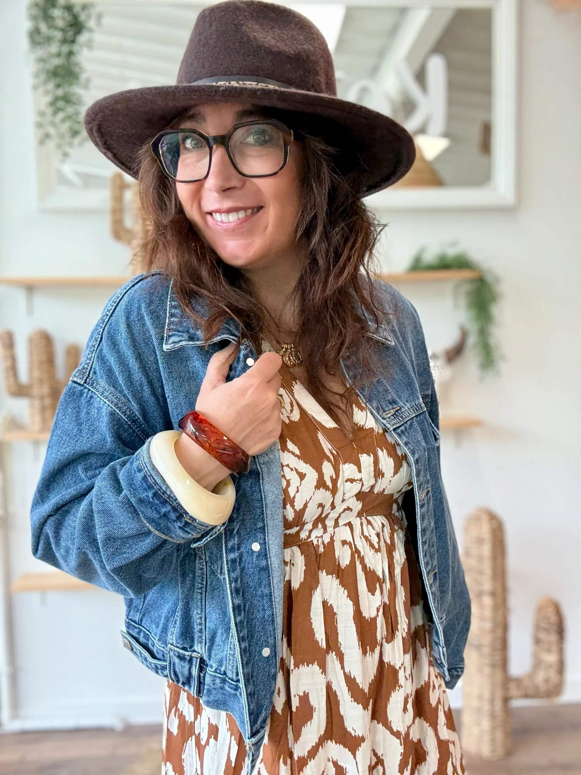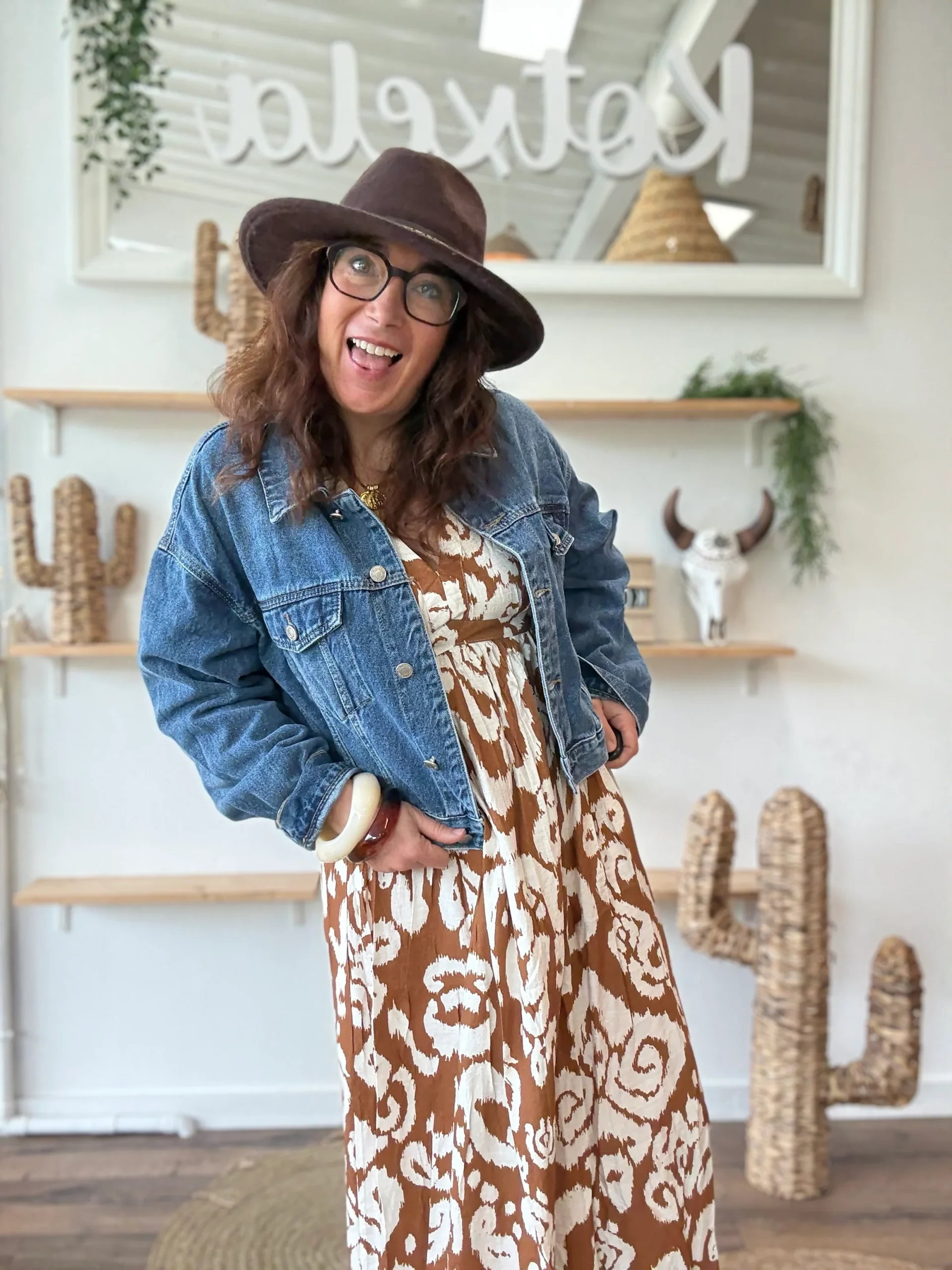 Conseil look : Glissez-la sur une robe longue imprimée pour un mix cowgirl-bohème irrésistible, ou associez-la à un jean flare et une ceinture western pour un total look denim affirmé 🤠.